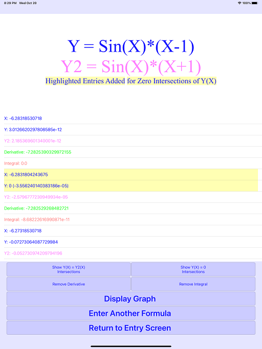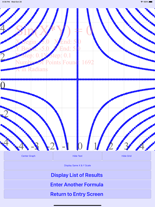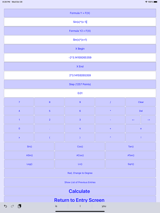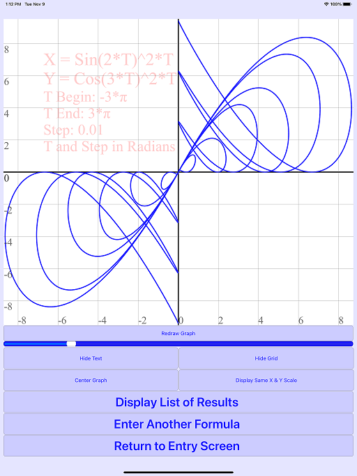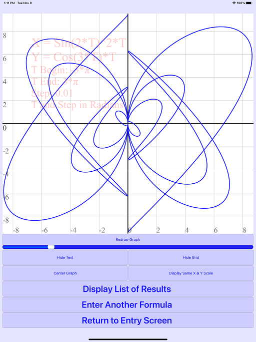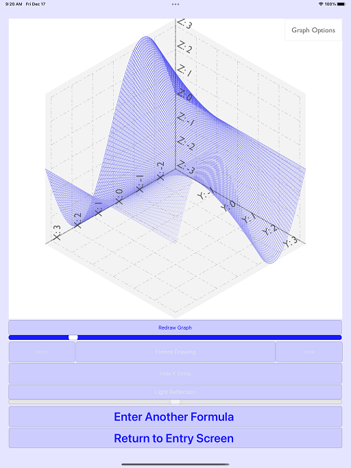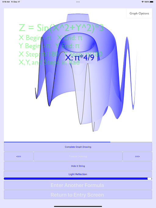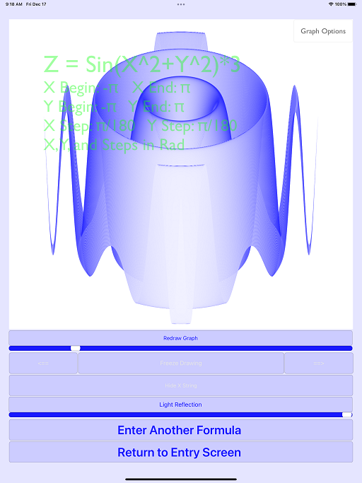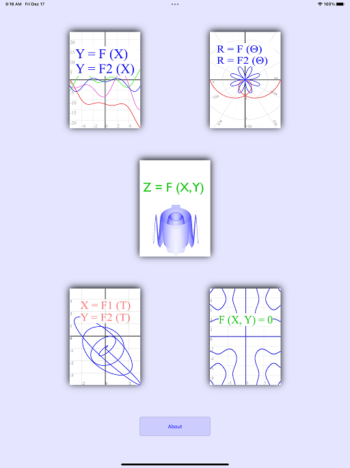 Cartesian 2D Y = F (X) functions: Graph displays the following curves: 1. One or two Y = F(X) functions. 2. Derivative of the first function. 3. Integral of the first function as a shade and a curve. Graph features: 1. Drawing is animated by X. 2. Clicking on the curves shows curve values, and finds closest point in the table. Tables: 1. All function, integral, and derivative values. 2. Zero intersections of first function. 3. Intersections between first and second functions. Polar 2D R = F(Θ) functions: Graph displays the following curves: 1. One or two R = F(Θ) functions. 2. Integral of the first function as a shade and a curve. Graph features: 1. Drawing is animated by Θ. 2. Clicking on the curves shows curve values, and finds closest point in the table. Tables: 1. Table of all function and integral values. 2. Table of zero intersections of first function. 3. Table of intersections between first and second functions. Parametric 2D X(T), Y(T) functions: Graph features: 1. Drawing is animated by T. 2. Clicking on the curves shows T, X, and Y values, and finds them in the table. Table of all points. F (X, Y) = 0 equations: Graph displays solutions as points. Clicking on the points shows X, and Y values, and finds them in the table. Table of all points. Cartesian 3D Z = F(X, Y) functions: Graphs can be: 1. Drawn as surface, lines, or dots. 2. Drawn with or without perspective, and with different light settings. 3. Tilted up or down. 4. Rotated around X, Y, or Z axis. 5. Drawing is animated by either X or Y. Table of all points can be sorted by either X or Y. Cylindrical 3D Z = F(Θ, R) functions: Graphs can be: 1. Drawn as surface, lines, or dots. 2. Drawn with or without perspective, and with different light settings. 3. Tilted up or down. 4. Rotated around Z axis or Θ = 0 axis. 5. Drawing is animated by Θ, R, or Z. Table of all points can be sorted by either Θ or R. Spherical 3D R = F(Θ, Φ) functions: Graphs can be: 1. Drawn as surface, lines, or dots. 2. Drawn with or without perspective, and with different light settings. 3. Tilted up or down. 4. Rotated around Z axis or Θ = 0 Φ = 90 axis. 5. Drawing is animated by either Θ or Φ. Table of all points can be sorted by Θ, Φ, or R Common features: 1. List of previous entries. 2. List of preset entries. 3. Undo and redo buttons for formula entries. 4. Automatic correction of errors in function limits or steps are offered. 5. All function points can be saved to clipboard in a table format. 6. All function points can be displayed on corresponding graphs. Common features of all images: 1. Animation frames can be frozen and moved back or forward. 2. Animation speed can be adjusted. 3. Zoom. 4. Scroll. 5. Save to Clipboard. 6. Color picker. More functions and UI improvements are coming! |